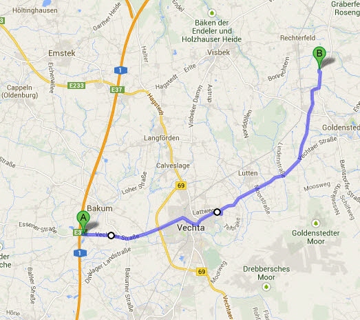 Dem Straßenverlauf bis Vechta folgen und im Stadtgebiet von Vechta der Ausschilderung Richtung Goldenstedt/Twistringen folgen.